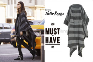 The cape will be on sale in all Bershka stores and at bershka.com starting the second week of October, in grey and black tones with wide stripe print.