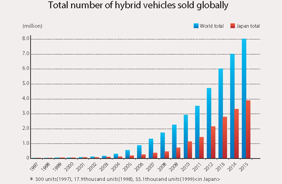 The Prius Concept Car introduced in 1995, with a capacitor to store electrical energy. Worldwide Appeal & Environmental Impact In 1997 Toyota introduced the world’s first mass produced hybrid vehicle—the Prius—offering much better fuel economy than any other vehicle powered by a gasoline engine. Prius surprised the world. The idea of the Prius has caught on since then. In 2008, there were a million new Priuses on the road. By 2013, it was three million2, indicating that the new eco-technology had gone mainstream and was no longer just something for a few environmentally conscious progressives—but rather the best choice for just about everyone. Hybrids are clearly becoming more and more popular. By July of 2015, Toyota had sold more than 8 million2 hybrids globally—which meant about 58 million tons less CO2 in the atmosphere.