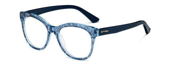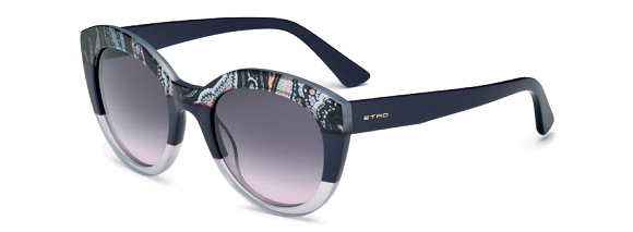 ET600S This model packs a strong visual punch thanks to its Cat-Eye shape and acetate front section, which features three stunning graphic effects: the upper section, enhanced by the unmistakable Etro paisley, blends into the full color of the center part before melding into the transparent acetate of the bottom section. Worn by Kate ftoss in the Fall/Winter 2015/2016 campaign, the model is available in the sophisticated color options of Black, Green, Blue and Purple.