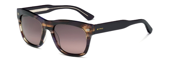 ET605S The clean, contemporary lines of the Wayfarer model is reinterpreted here thanks to the use of an original streak-effect acetate. Refined detailing, such as the metal frame of the temples, personalized with an Etro graphic, and the unmistakable logo on the front section, add further personality to the glasses.