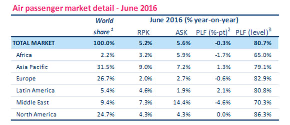 -Terrorism, Economic Uncertainty, Weigh on Traffic-- Dubai, UAE, August 4, 2016: The International Air Transport Association (IATA) announced global passenger traffic data for June showing that demand (measured in revenue passenger kilometers or RPKs) rose by 5.2% compared to the year-ago period. This was up slightly from the 4.8% increase recorded in May (revised). However, the upward trend in seasonally-adjusted traffic has moderated since January. June capacity (available seat kilometers or ASKs) increased by 5.6%, and load factor slipped 0.3 percentage points to 80.7%. “The demand for travel continues to increase, but at a slower pace. The fragile and uncertain economic backdrop, political shocks and a wave of terrorist attacks are all contributing to a softer demand environment,” said Tony Tyler, IATA’s Director General and CEO.