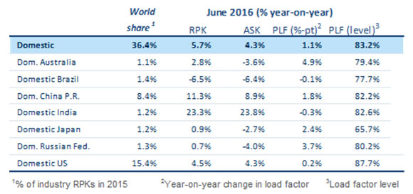 Domestic Passenger Markets Demand for domestic travel climbed 5.7% in June compared to June 2015, while capacity increased 4.3%, causing load factor to rise 1.1 percentage points to 83.2%. All markets reported demand increases with the exception of Brazil. - India continued to lead all markets with a 23.3% rise in domestic traffic, propelled by strong growth in real consumer spending as well as by the fact that airlines are adding airport pairs and frequencies.