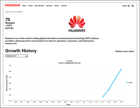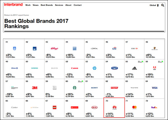 Continued investment in R&D, steady growth and breakthrough consumer products supports climb in rankings for third year in a row Dubai, U.A.E., 7th October 2017: The world's leading brand consulting firm Interbrand, has announced its 2017 Best Global Brands Report and confirmed Huawei’s move to number 70 -two spots up from its ranking in 2016. Brand valued at approximately USD $6.676 billion; Huawei has grown by 14 percent over the past year.