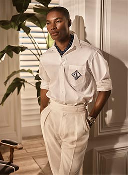 Accessories and fashion jewelry express a modern sensibility. The handbag collection contrasts a luxurious color palette with seasonal animations. Iconic styles such as the RL50, Ricky, and Voyager are introduced in new colorways and finishes such as textural denim patchwork, hand-painted florals, and palm-leaf summer totes. In footwear, styles range from sleek sandal silhouettes to espadrilles and sneakers for a casual, summery feel. Ralph Lauren introduces new icons for the Collection through a flat and heeled sandal featuring stirrup hardware detail. The accessories family is made complete with a collection of scarves in various Art Deco and floral prints. Men’s Spring 2021 Purple Label features an interplay of rich dark brown linens and natural textures, including beautiful silk linen tweeds, luxurious shantung silk, rustic linen pinstripes, and fine tropical wool crêpe. Featherweight chocolate brown suede and burnished brown Italian calfskin add additional richness and dimension. Patterns range from stunning tropical florals to exotic animal prints, and from a spectrum of luxe linen plaids to gorgeous iconic stripes in creams and browns. Suit fabrics are soft and lightweight, and are complemented by elegant silk and cashmere fine-gauge sweaters. Elements of navy, cream, and Mediterranean washed denim are interjected to create an unexpected yet refined and effortless sophistication.