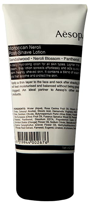 Moroccan Neroli Shaving Serum is packaged in 50 mL and 100 mL pump bottles, and is available from the Aesop store in the Mall of Emirates and Aesop.ae. PRICE | 100 mL | 195 AED POST SHAVE LOTION  Aesop’s Moroccan Neroli Post-Shave Lotion contains botanical extracts distinguished by their nourishing and calming properties, making this product perfectly suited for use post-shaving. A lightweight lotion, it absorbs effortlessly to replenish moisture through the inclusion of hydrating Shea Butter, Rosehip Oil and Sandalwood. Panthenol, Bisabolol and Ginger Root extract - noted for their soothing properties - combine to assuage sensitive or shaving-stressed skin. Moroccan Neroli Post-Shave Lotion is packaged in a 60 mL aluminium flip-top tube; it is also available as part of the Moroccan Neroli Shaving Duet, partnered with its Serum counterpart. It is available from Aesop signature stores, counters in select department stores globally, and at Aesop Online. PRICE | 60 mL | 180 AED All Aesop products are vegan and cruelty-free, and no ingredient utilised in our formulations is tested on animals.