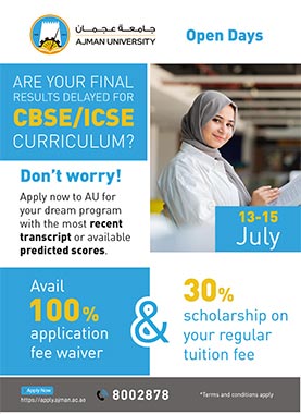 Ajman, United Arab Emirates, July 12, 2021: As part of its strategy to reward ambitious CBSE/ICSE students for their outstanding performance and remarkable determination, Ajman University (AU) is offering them a 100% waiver of application fees and a 30% discount on their tuition fees for a full academic year on select programs. Programs covered in the offer include- Business Administration, Architecture, Art and Design, Pharmacy and Health Sciences, Engineering and IT. It is worth mentioning that all Ajman University programs are accredited by the UAE Ministry of Higher Education & Scientific Research (MOHESR).